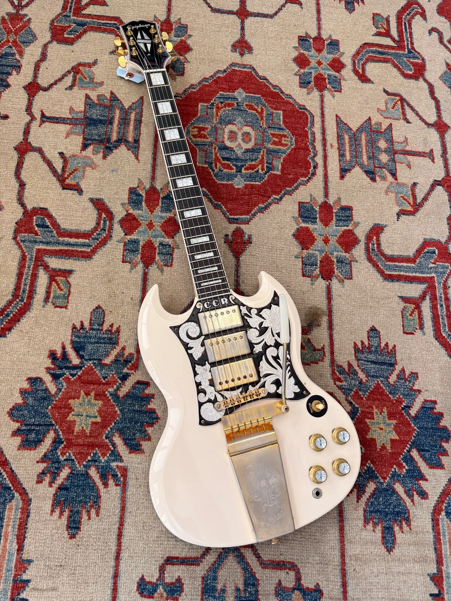 Finished in that clean ivory/white with gold hardware and all the Custom appointments—block inlays, bound board, triple pickup layout—it’s already pulling from that 1960s “fancy but dangerous” SG lineage . But the real story here is under the hood…