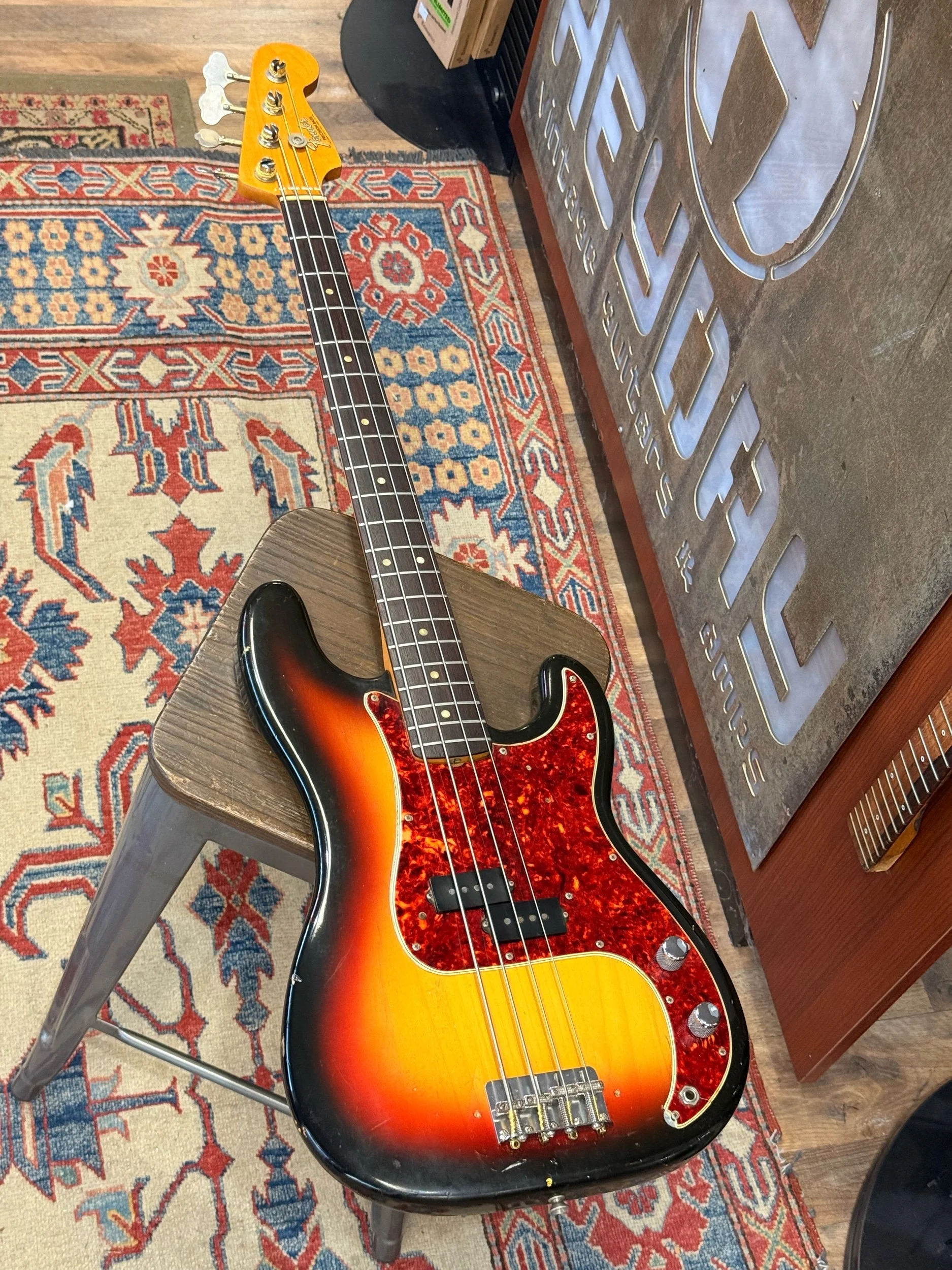 This one wears a beautifully aged 3-tone sunburst, complete with honest playwear that only decades of music can create. The tortoise guard, rosewood fingerboard, and transition-logo headstock all scream classic CBS-era Fender. Plug it in and you get that unmistakable, thumpy, rounded Precision Bass sound—warm, authoritative, and effortlessly musical.